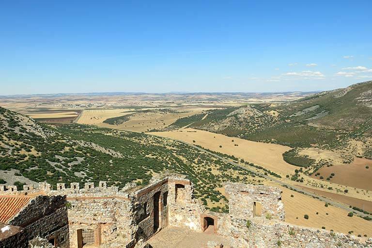 Panoràmica de domini visual des del castell de Calatrava la Nueva cap a la Meseta i sobre el canal de pas