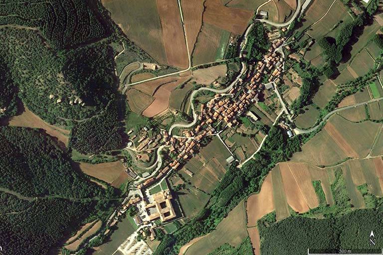 Monestir de Yuso-San Millán de la Cogolla amb el poblat alineat sobre el camí d'arribada (Google earth 2023-11-16)