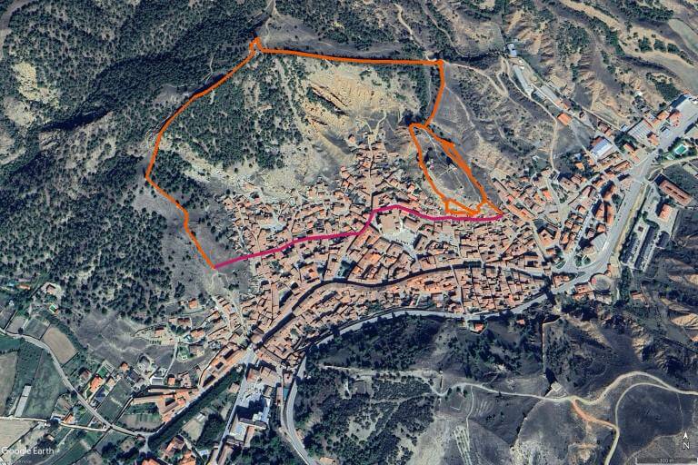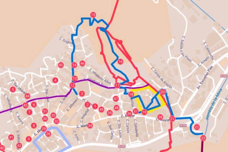 Calle Arrabal – c. San Martín de la Parra – c. Valcaliente (dir. norte) – pl. San Miguel – c. San Miguel – C. San Valero – pl. San Juan – c. del Moral – Pozo San Vicente – c. Hiladores Altos–P. Joaquín Costa- c. Marquesa- Plaza Sinués y Ubiola