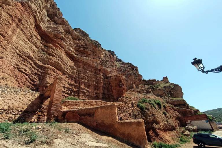 Para garantiza la protección de las murallas sobre el caserío asentado en la ladera norte y el valle, las murallas ascienden por la cresta de la hoya. A media altura del lado de levante la erosión dejo un altiplano alargado que fue aprovechado para el asentamiento de la alzaba-castillo Mayor.