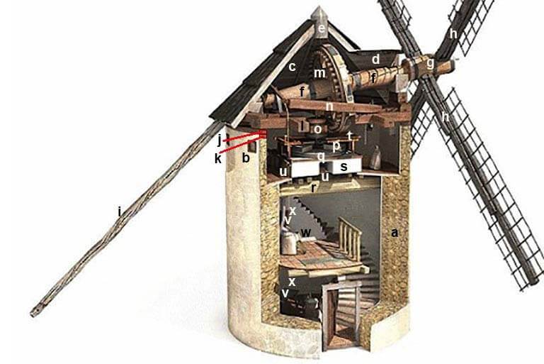 Por un punto de la base de la cubierta sobresale el eje del molino (f) al que están acopladas las aspas (h). Por el lado opuesto de la salida del eje, de la pendiente de la cubierta se prolonga el palo de gobierno (i) hasta casi ras del suelo.