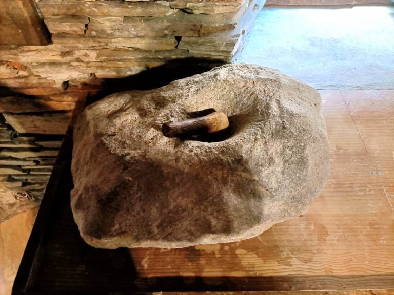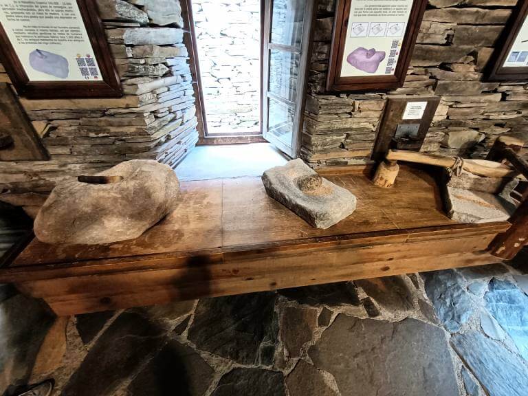 En este recorrido se han situado dos molinos de percusión, que no utilizan piedras o muelas para moler, sino que machacan los granos en unos cuencos de madera o de piedra, donde se deja caer una maza de madera percutiendo sobre el grano para romperlo.