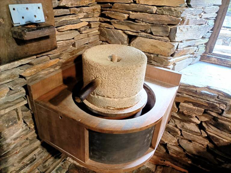 Al otro lado de la sala, sobre un gran bancal de madera, un molino de muelas clásico, accionado por un embarrado que parte del generador moderno, con el cedazo en la parte baja delantera.