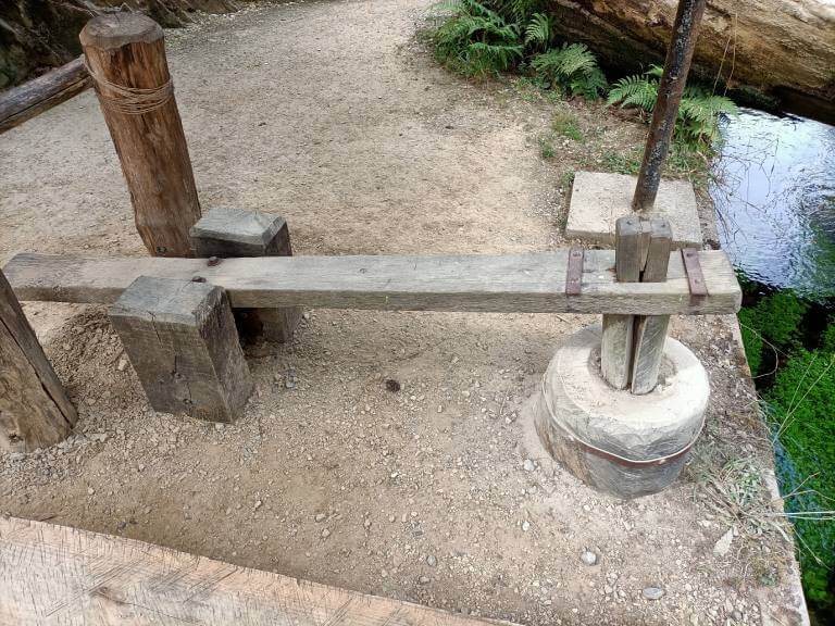 El primer artilugio que se encuentra un monjolo de dos mazos. La molturación se produce de la misma forma que en el monjolo brasileño que hemos visto antes, por golpeo de un mazo dentro de un cuenco de piedra.