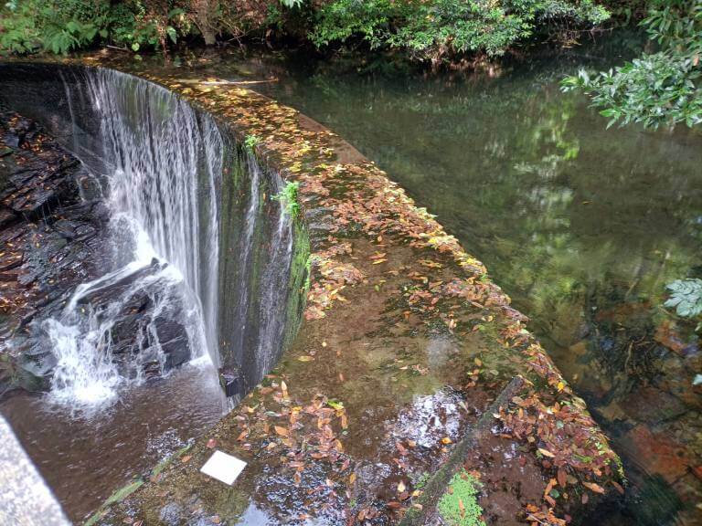 Pasado el acueducto se observa en primer lugar un rebosadero diseñado de tal forma que la caída del agua forme una espléndida lámina.