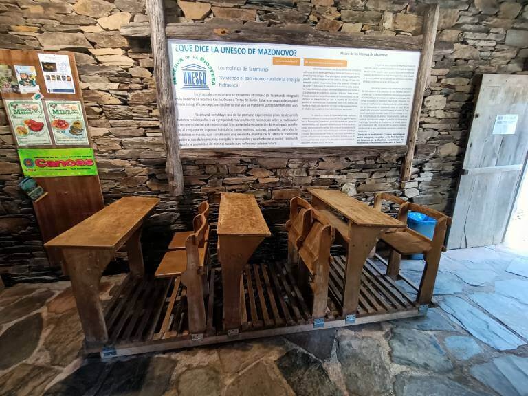 Terminada la visita, el camino a la salida se efectúa a través de una pasarela de madera sobre el río y una habitación en la que encontramos los bancos de una antigua escuela y un panel sobre lo que dice la UNESCO de Mazonovo y sobre el Museo de los Molinos.
